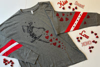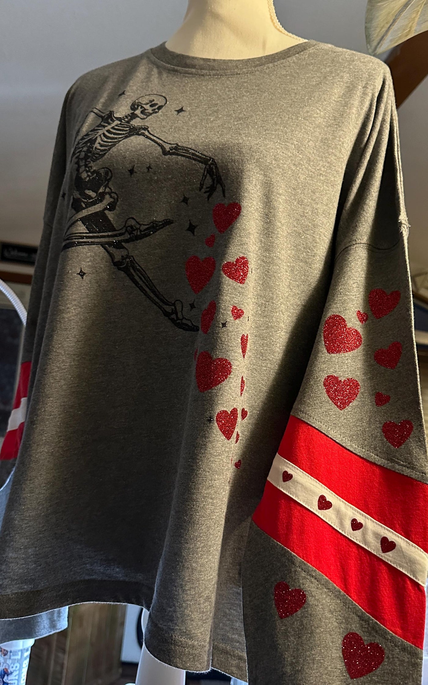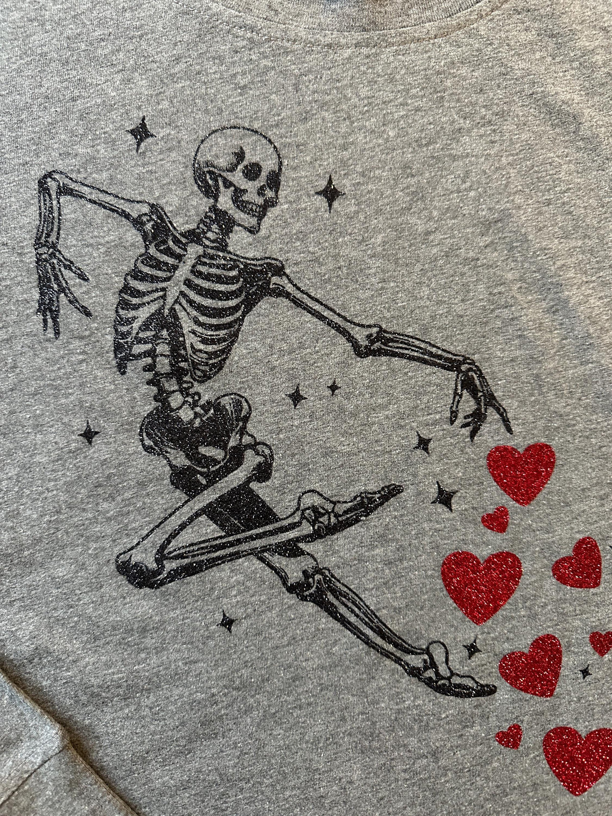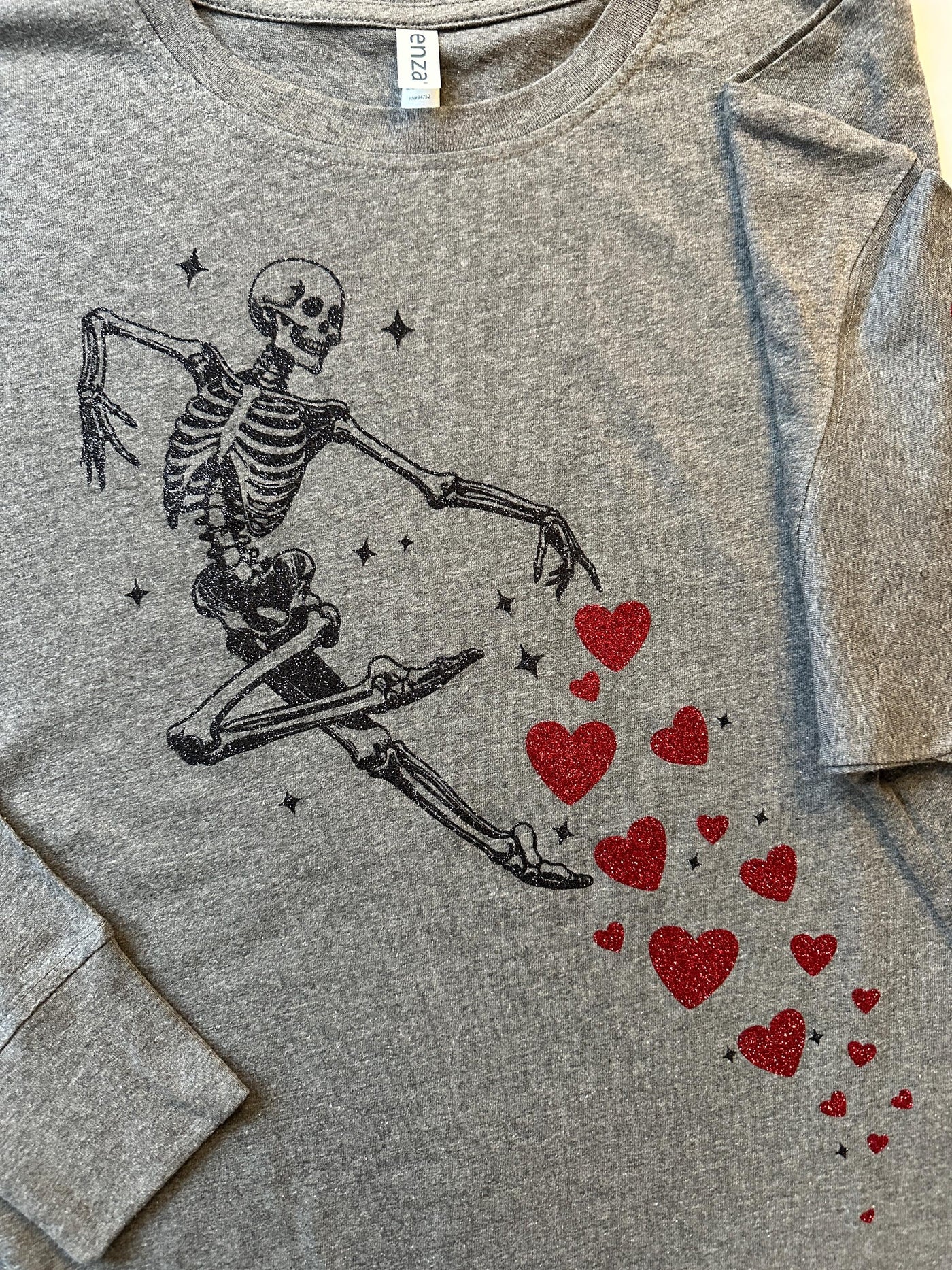 Dancing Skeleton Valentines Long sleeve T-shirt with hearts Varsity style t-shirt for valentines day skeleton ballerina style glitter - S